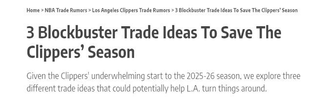 不难看出,伤病潮是压垮快船的核心稻草。新援比尔因髋部骨折赛季报销,小德里克・琼斯右膝韧带扭伤缺阵六周,伦纳德因为伤病属性打打停停,仅剩哈登独自带队,等伦纳德回归后,哈登又因为前期体能付出太多,效率低迷。角色球员集体失准让困境加剧,替补席得分联盟倒数第五。攻防两端的全面崩盘更触目惊心:进攻评分113.6排联盟第20,防守评分119.4跌至第25,与休赛期“攻防均衡”的预期判若两队。美媒露天看台发文表示,令快船管理层绝望的是,快船连重建的资格都没有,如果他们就此摆烂,只会让雷霆白捡状元签。此外,哈登、伦纳德的交易价值不大,快船能做的就是继续补强,想尽一切办法拯救这支球队。露天看台也列出了三笔解救快船的交易方案,一起去探讨一下!